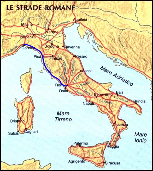 IV. Via Aurelia: strada costiera che andava a Nord: collegava l'Urbe con Vada Sabatia (Vado Ligure), attraverso Pisae, Luna e Genua.